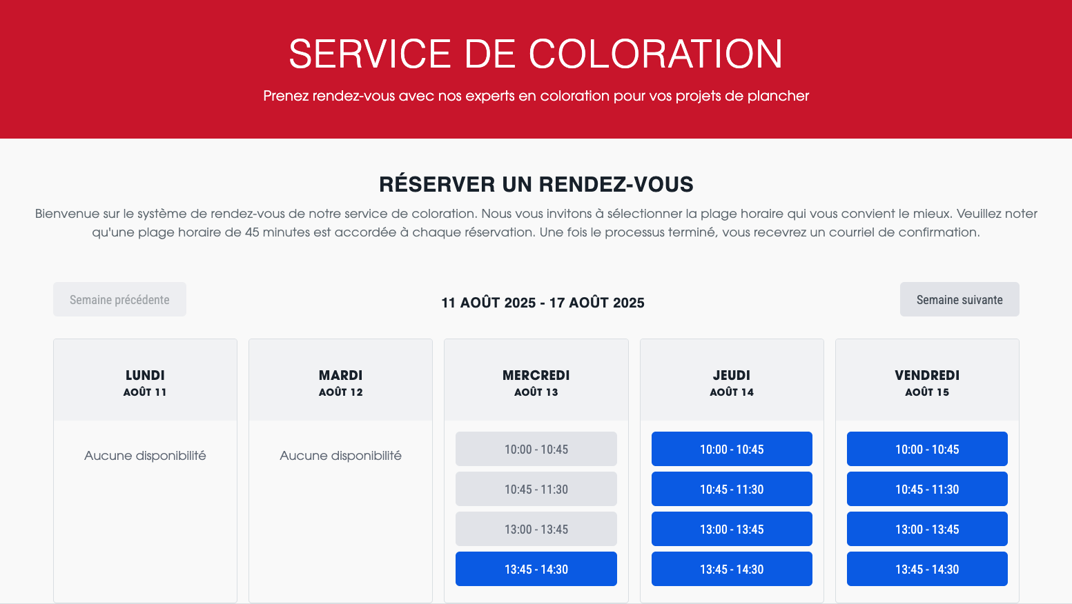 - CHAQUE JOURNÉE DISPOSE DE QUATRE PLAGES HORAIRES DE 45 MINUTES. QUE CE SOIT POUR DÉPOSER UN COLORMATCH OU POUR FAIRE LE CHOIX D'UNE COULEUR, LE NOMBRE DE DISPONIBILITÉS RESTE LE MÊME.